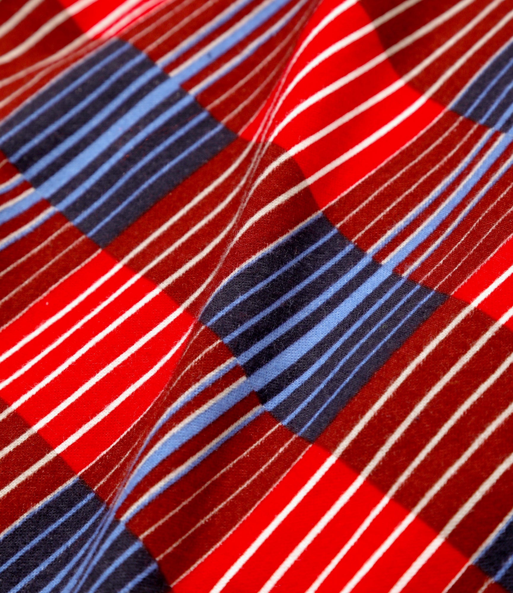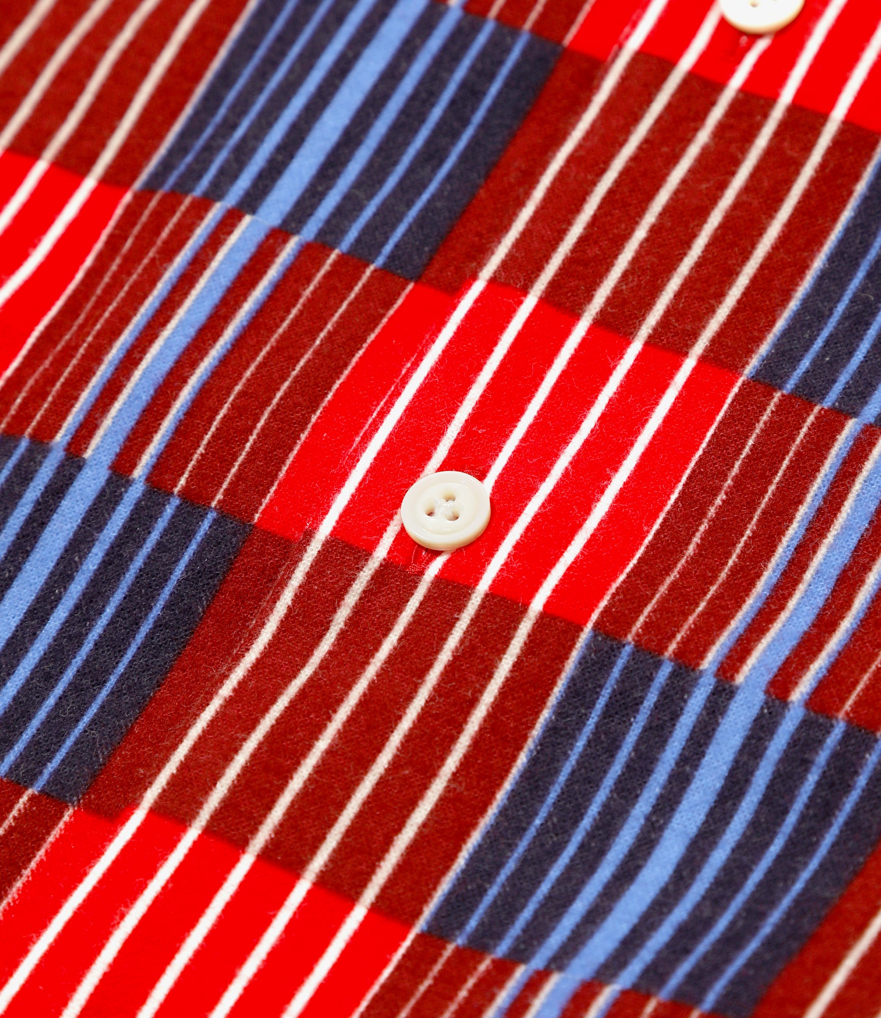 鮮やかな発色とヴィンテージのような風合いが魅力の生地は、理想とする適度なコシと柔らかな肌触りにこだわって生産したオリジナルのフランネル生地に、日本が誇る伝統的な染色技法「手捺染(てなっせん)」によるプリントで製作。