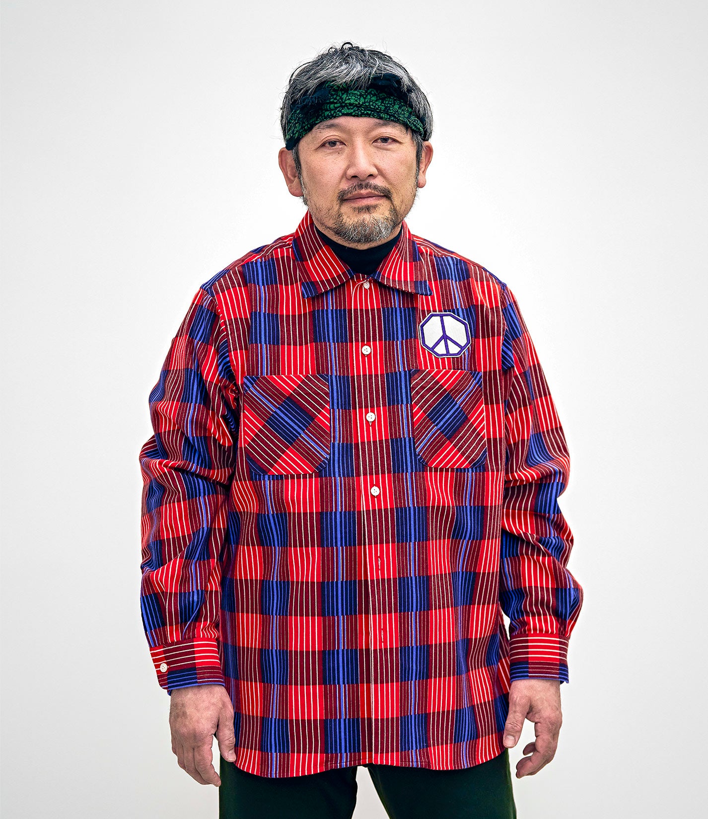 また、ボタンは特注で製作したシェル製の三穴ボタンを採用。胸にはワッペンとして制作したオクタゴン型のピースマーク(「花、太陽、雨」プロジェクトのシンボル)を取り付けて仕上げました。